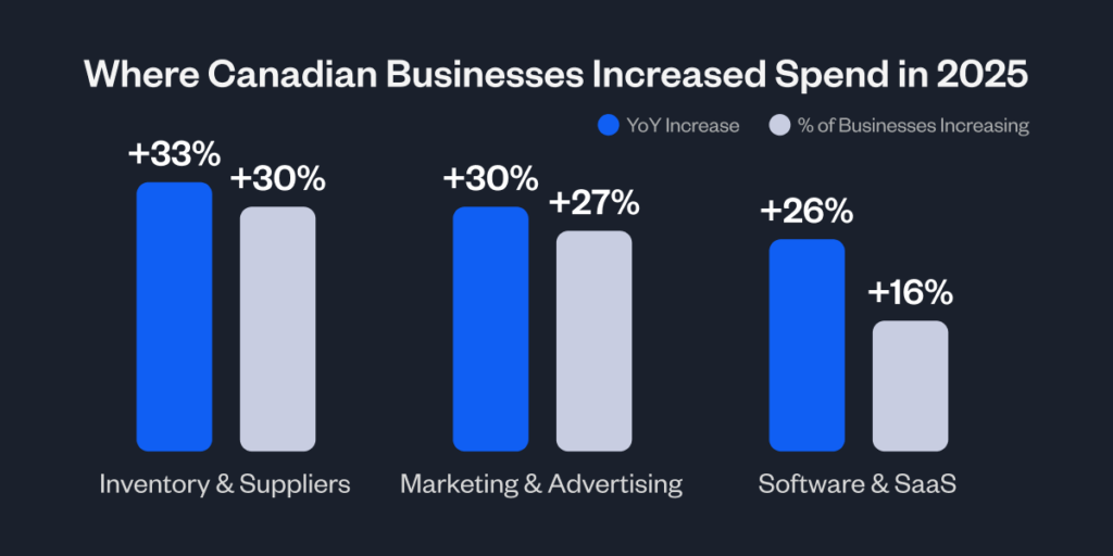 Our spend trend data tells a similar story. Costs are rising across the board, but only a small fraction of businesses are leaning into growth levers. Marketing and advertising spend jumped 30%, yet just 27% of businesses drove that increase. Inventory and supplier costs rose 33%, with less than a third increasing spend significantly. Software and SaaS spend climbed 26%, concentrated among only 16% of businesses.